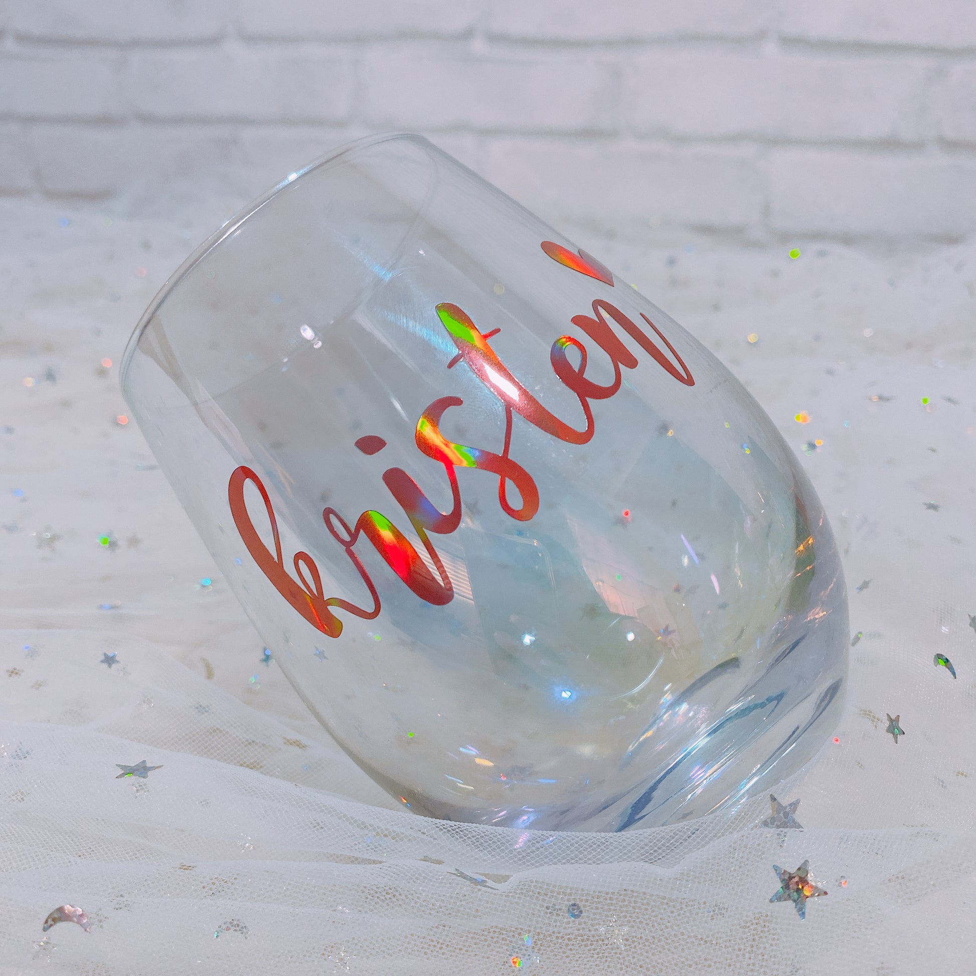 Fancy iridescent stemless wine glass which sparkles rainbow shadows under lights! Great for parties or personal use and it can hold all types of beverages.
